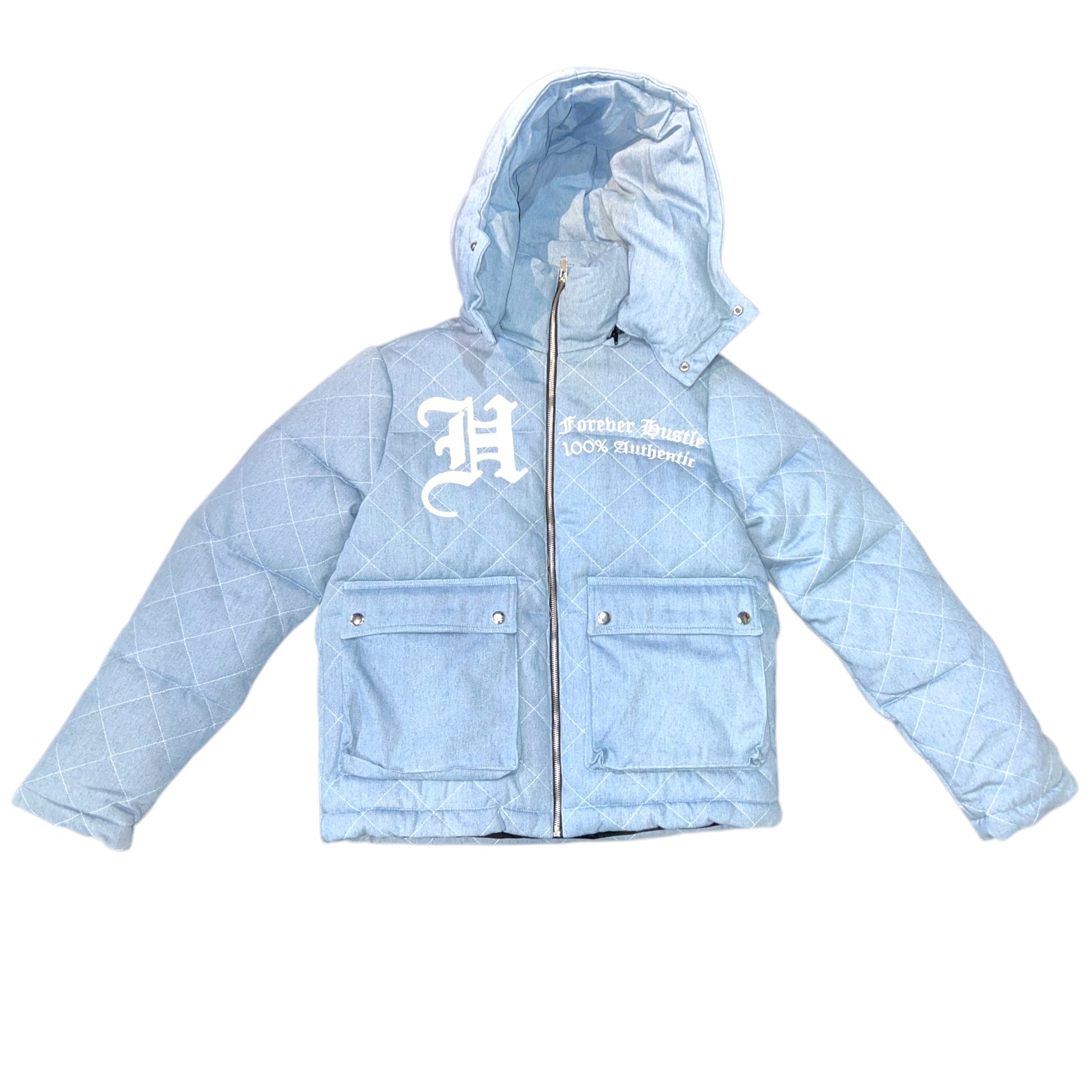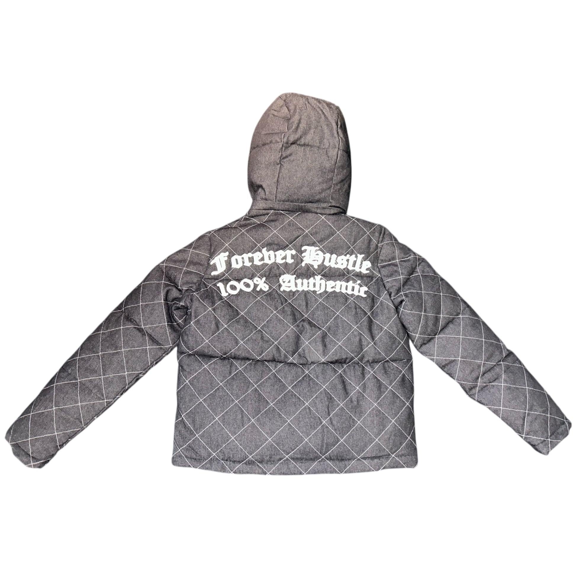 The structured silhouette features a full front zip, oversized utility pockets with snap closures, and a padded hood for added protection and comfort. Finished with signature Old English branding—“Forever Hustle – 100% Authentic”—printed across the chest and back, this piece makes a bold statement from every angle.