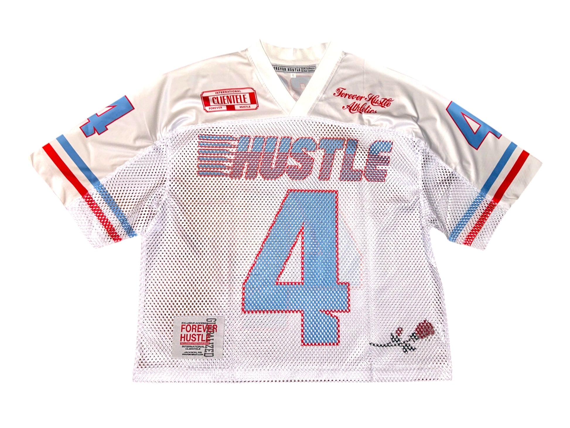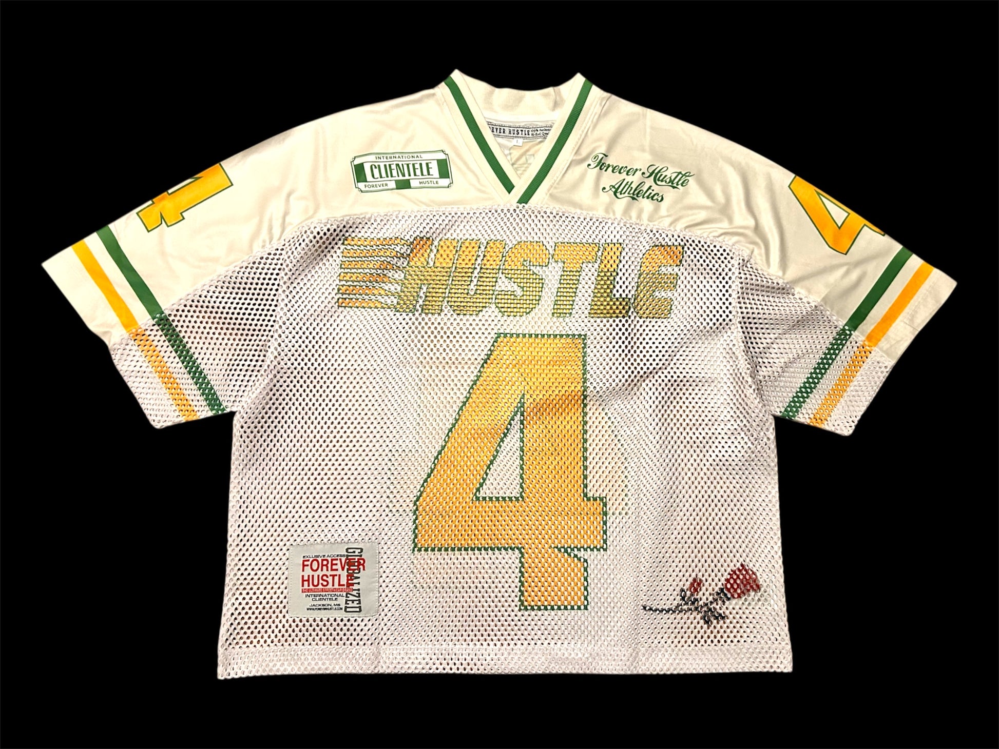This bold mesh jersey features an oversized #4, “HUSTLE” on the front, and “FOREVER” on the back—symbolizing nonstop ambition. With breathable mesh, classic athletic stripes, and premium branding from Forever Hustle Athletics, this piece blends streetwear and hustle culture perfectly.